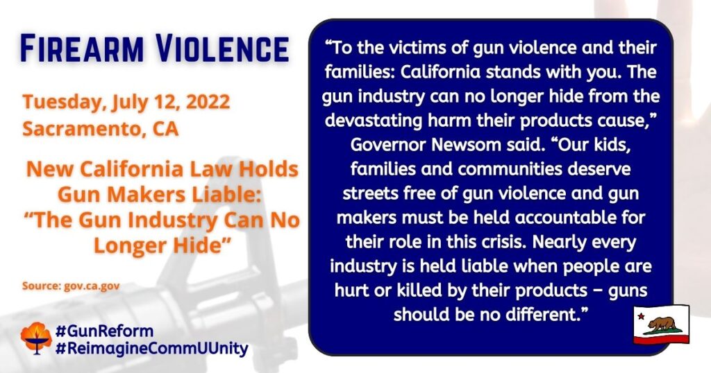 SACRAMENTO, CA, July 12, 2022 – Governor Gavin Newsom signed Assembly Bill 1594 today. The bill “establishes a “firearm industry standard of conduct” and allows local governments, the state Department of Justice and gun violence survivors to sue for egregious violations of state sales and marketing regulations.” from LA Times.