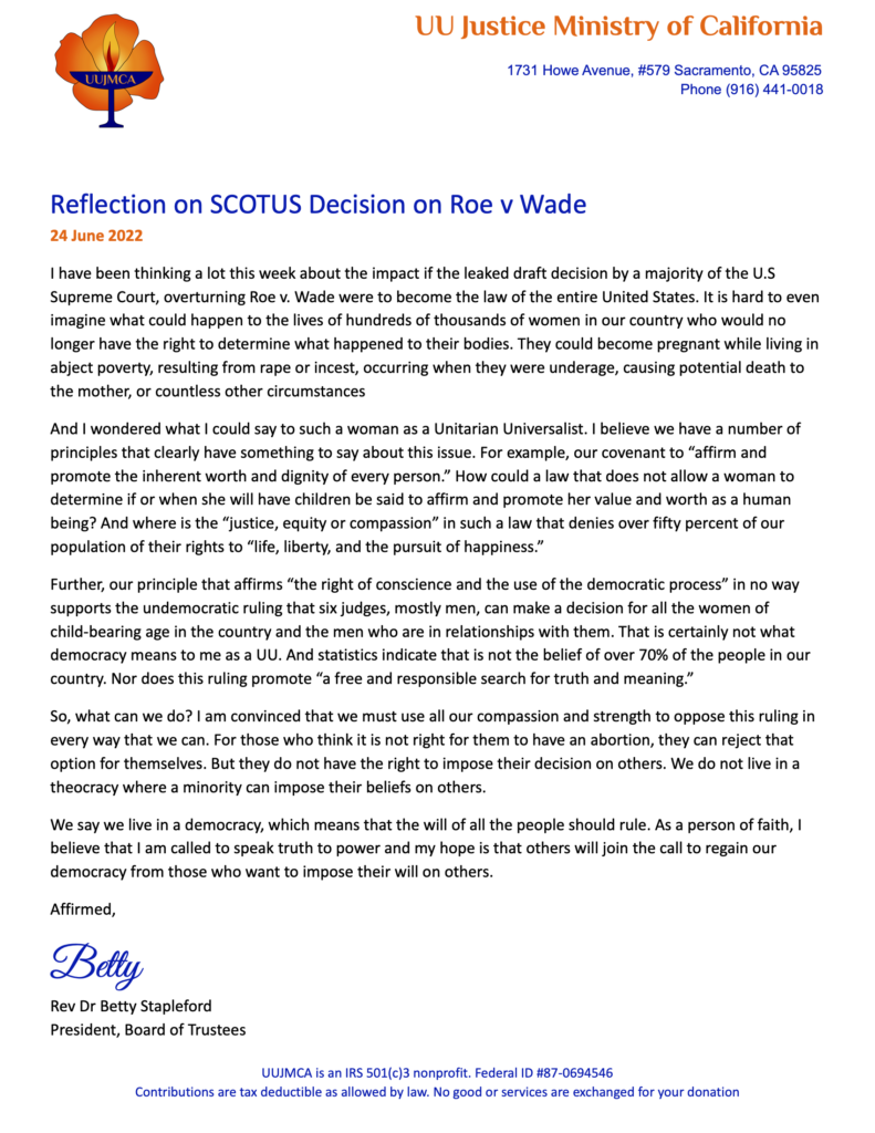 Further, our principle that affirms “the right of conscience and the use of the democratic process” in no way supports the undemocratic ruling that six judges, mostly men, can make a decision for all the women of child-bearing age in the country and the men who are in relationships with them. That is certainly not what democracy means to me as a UU. And statistics indicate that is not the belief of over 70% of the people in our country. Nor does this ruling promote “a free and responsible search for truth and meaning.”